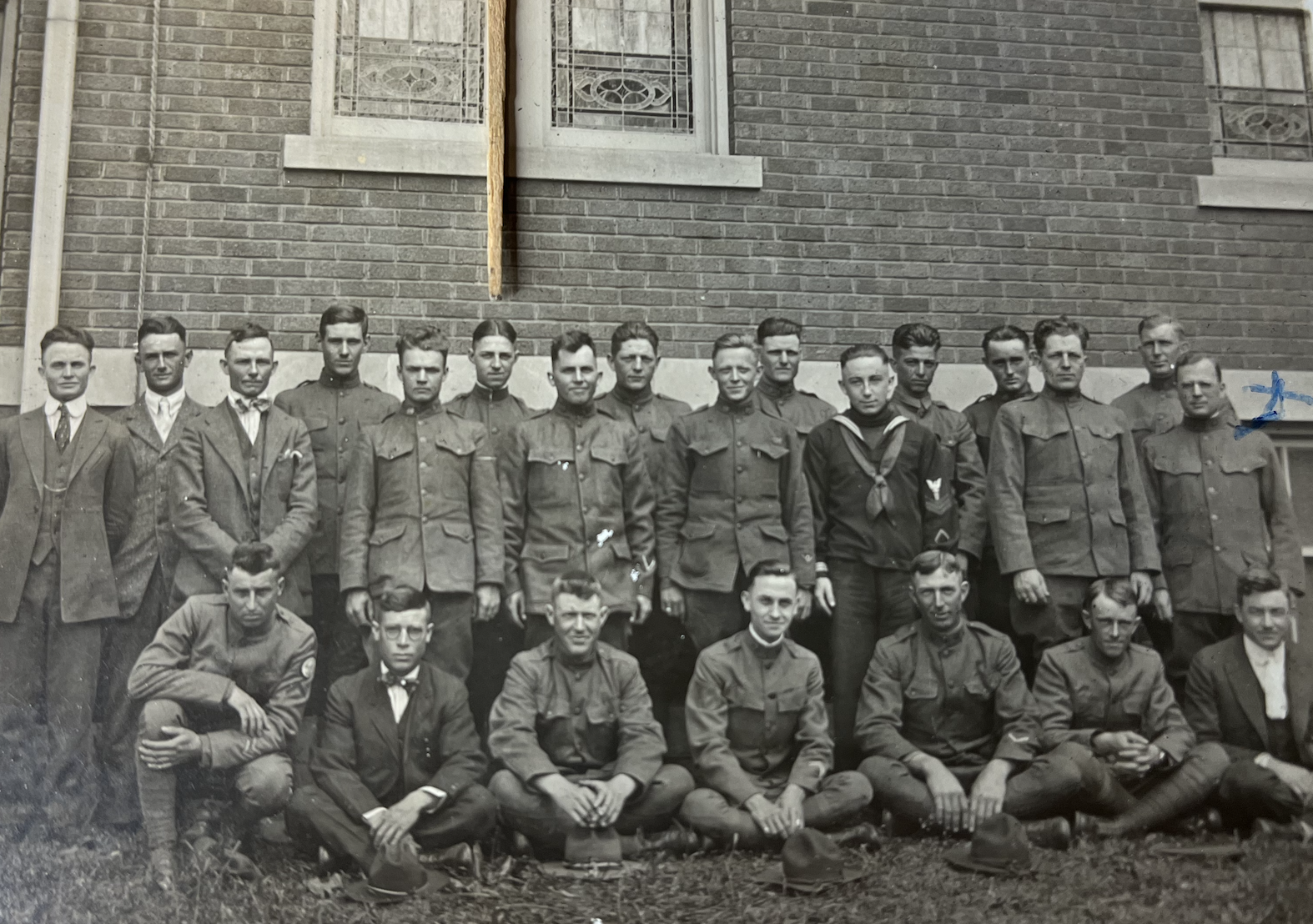 I found this picture online and purchased it. Shows a few young men who signed up for the War just before it ended. They were sent to Army Camps and then were discharged. T. Frank, as he was called, (6th from left standing) 18 years old, worked on a farm…